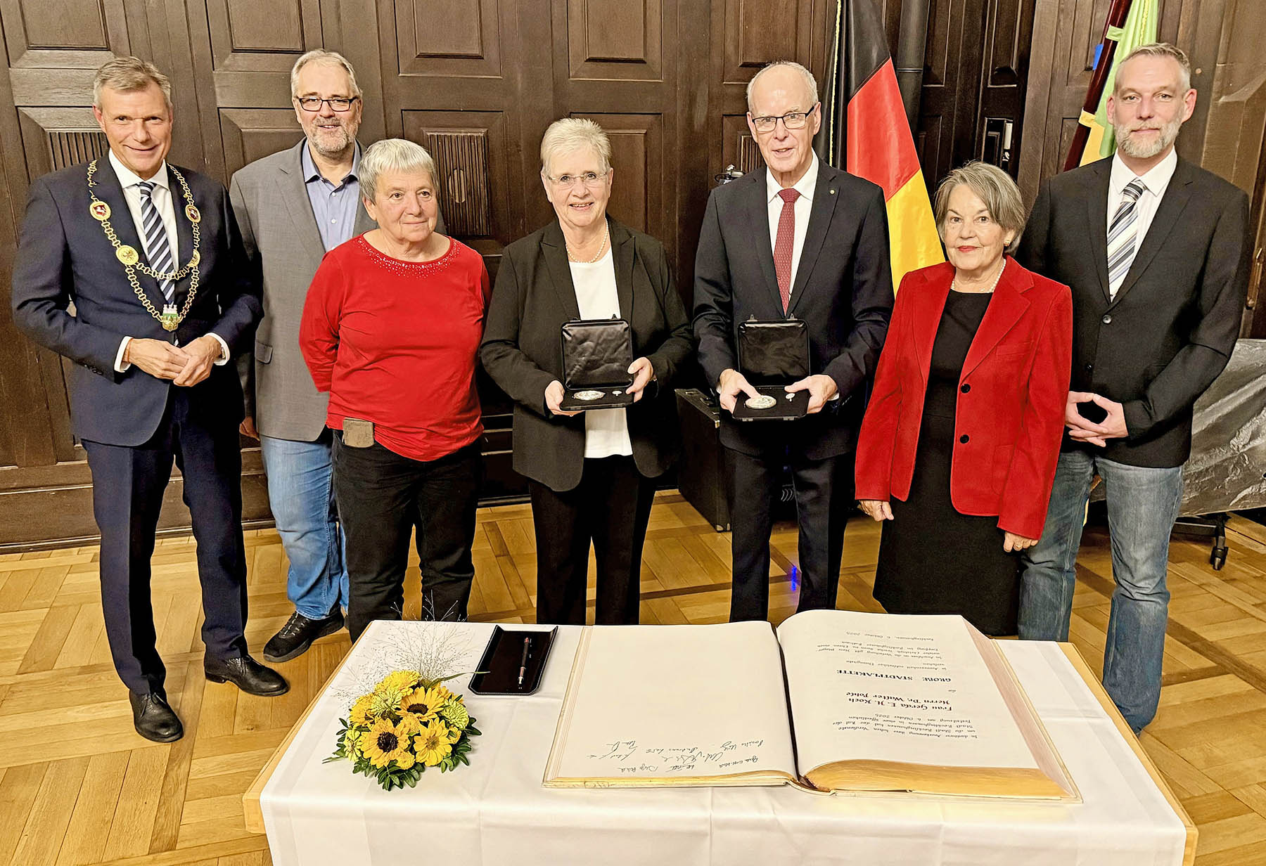 Foto (Stadt RE): Bürgermeister Christoph Tesche (l.) vergab die Große Stadtplakette im schönsten Rathaus von NRW an Gerda E. H. Koch (4.v.l.) und Dr. Walter Pohle (3.v.r.), die sich gemeinsam mit ihren Partnerinnen Roswitha Killinger (3.v.l.) und Inge Pohl (2.v.r.) sehr über die Auszeichnung freuten. Die Laudationes hielten Benno Portmann (2.v.l./CDU) und Michael Materna (r./SPD).